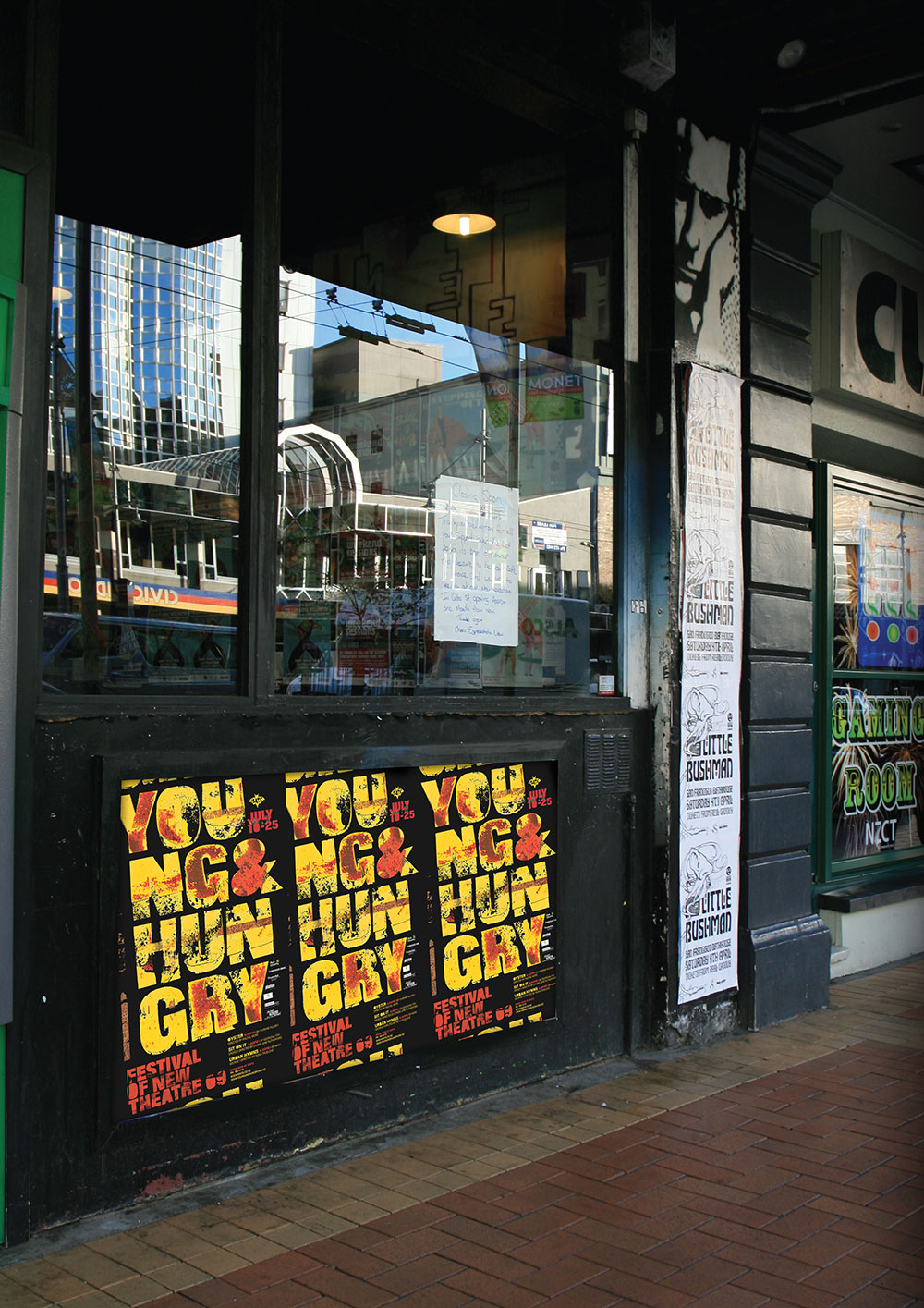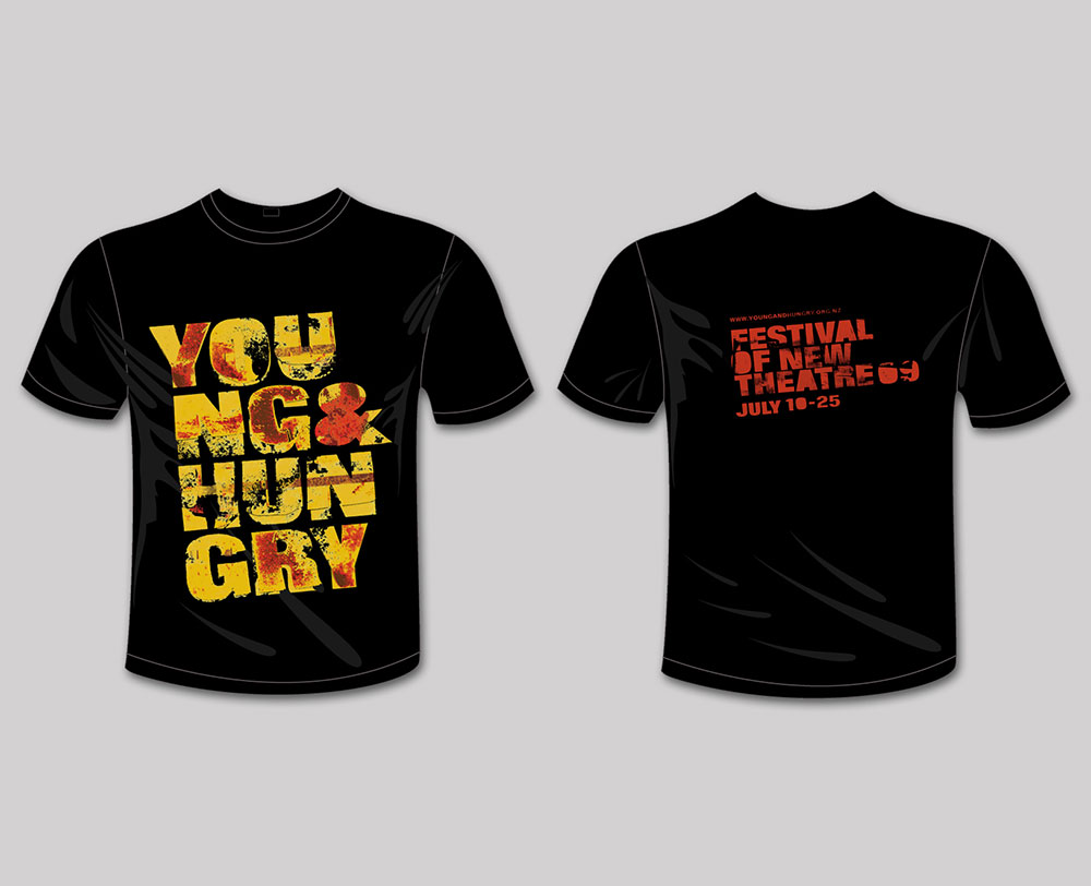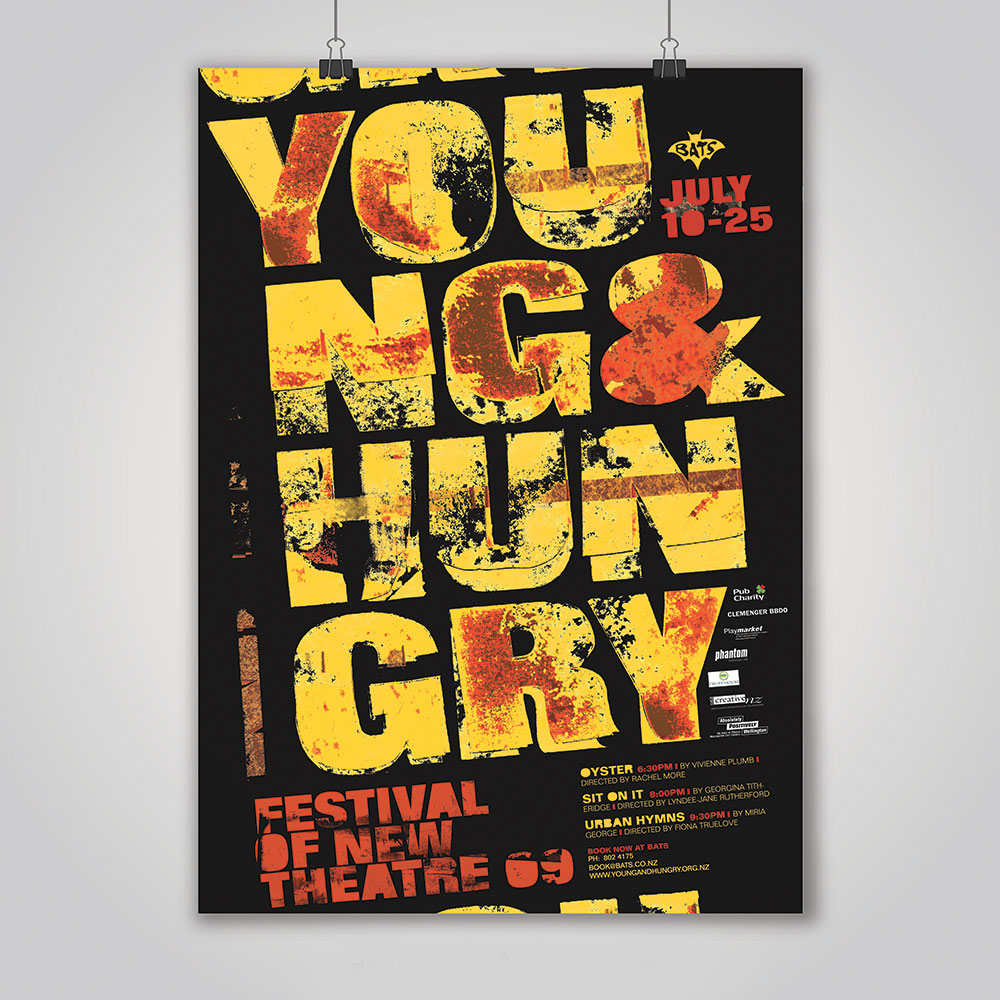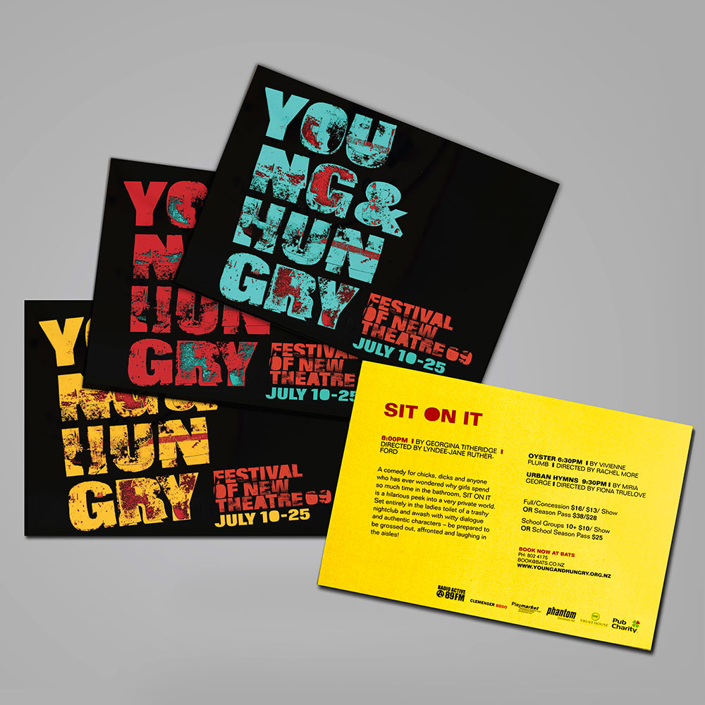 Identity for the launch of the Young & Hungry FESTIVAL OF NEW THEATRE. The color and grunge textural effect reflects the young and energetic audience and the spirit of the people involved in the play. Different colors were used to differentiate between the various plays and sets the tone for the plays.
